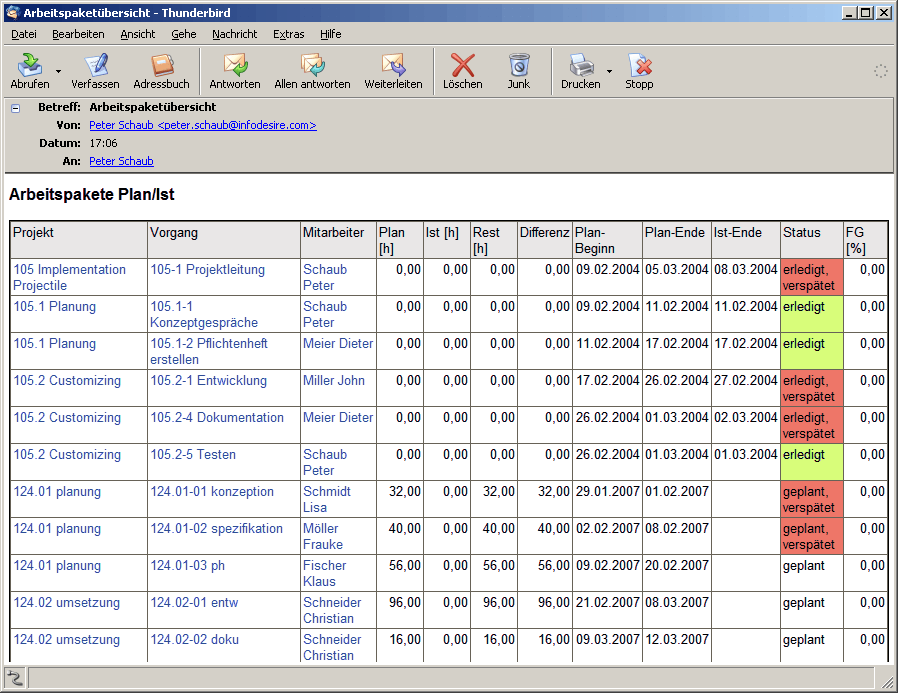 Der Zeitdienst erzeugt (solange er aktiv ist) periodisch Plan/Ist-Vergleiche auf Arbeitspaketebene für alle ausgewählten Projekte, bezogen auf das aktuelle Quartal und sendet diese Daten per Email an die Empfänger.