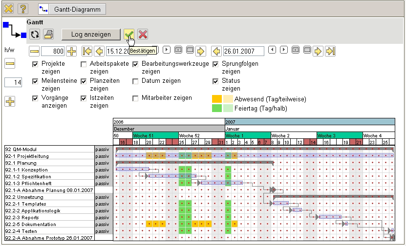 Das Gantt-Diagramm in der Projektplanung beinhaltet zahlreiche Optionen. Im oberen Bereich stehen beispielsweise die Reload-Funktion, der Druck-Modus und das Ereignis-Log zur Verfügung.
