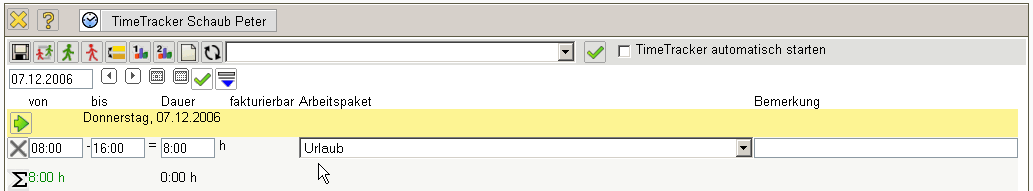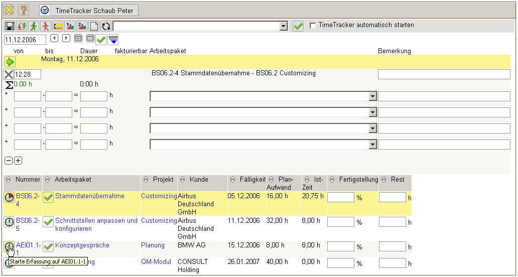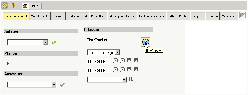 Die Erfassung der Arbeits- und Projektzeiten sowie der Abwesenheiten wird mit dem TimeTracker realisiert. Diese Komponente befindet sich im Arbeitsbereich und wird durch Mausklick auf die Uhr, im Beispiel für den 11.12.2006, ausgewählt.