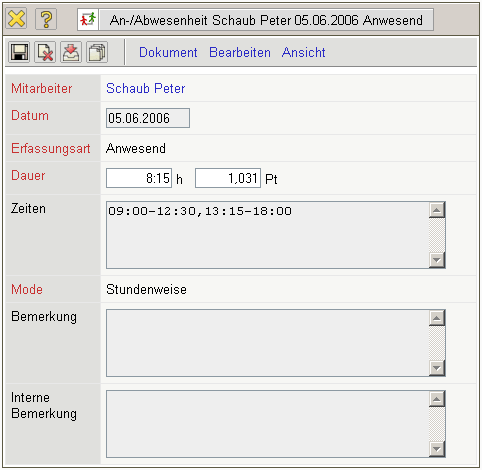 Nach dem Öffnen eines neuen Dokumentes vom Typ “An/Abwesenheit”, werden die o.g. Felder vorbelegt.