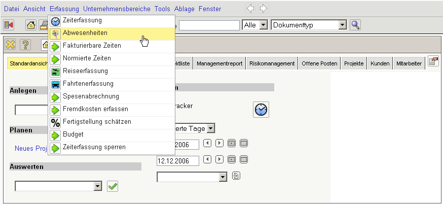 Anmerkung: Die Abwesenheiten können auch im Arbeitsbereich, im Dokumenttyp An/Abwesenheit, oder im TimeTracker erfasst werden.