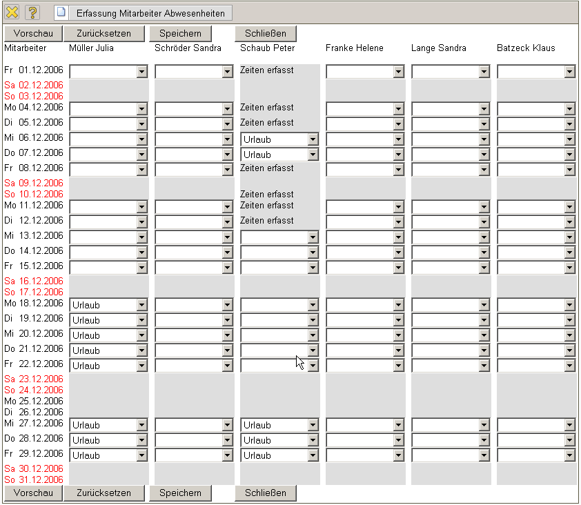Im zweiten Beispiel wird beim Mitarbeiter Peter Schaub der Urlaub vom 20.12.2006 bis 22.12.2006 …