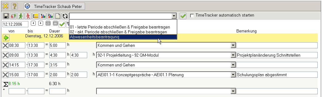 Im folgenden Beispiel wird vom Mitarbeiter Peter Schaub Urlaub vom 18.12.2006 bis zum 29.12.2006 beantragt.