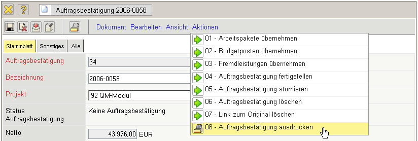 Die Auftragsbestätigung kann mit Hilfe der Aktion 08 …