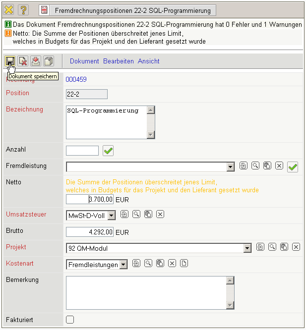 … abgespeichert. Wenn bei einer Position der Rechnungsbetrag das Gesamtbudget des Projektes für den Lieferanten übersteigt, warnt das System mit einer entsprechenden Meldung.