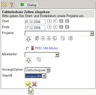 … öffnet sich ein Dialog. Hier werden der Leistungszeitraum, die Projekte und/oder Mitarbeiter die Anzeigeoption (Zeitschnipsel oder Arbeitspaket) und eine Prüfoption ausgewählt. Im folgenden Beispiel wird für den Zeitraum 01.12.2006 bis zum 17.12.2006 für das Projekt 27 QM-Modul jede einzelne ungeprüfte Zeiterfassung angezeigt.