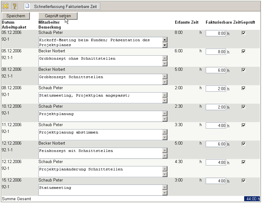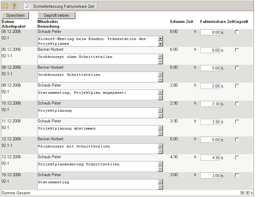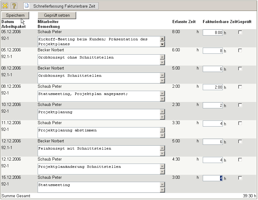 Bereits bearbeitete Zeiteinträge können auf “Geprüft” gesetzt werden. Nach dem Abspeichern werden bei der Rechnungsstellung die fakturierbaren Leistungen zur Weiterbearbeitung verwendet.