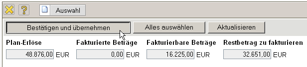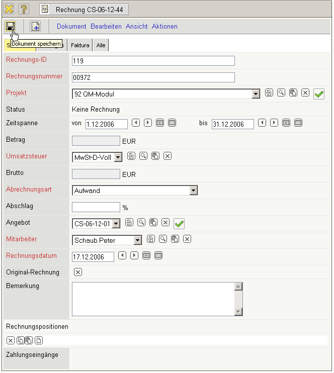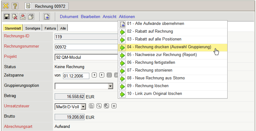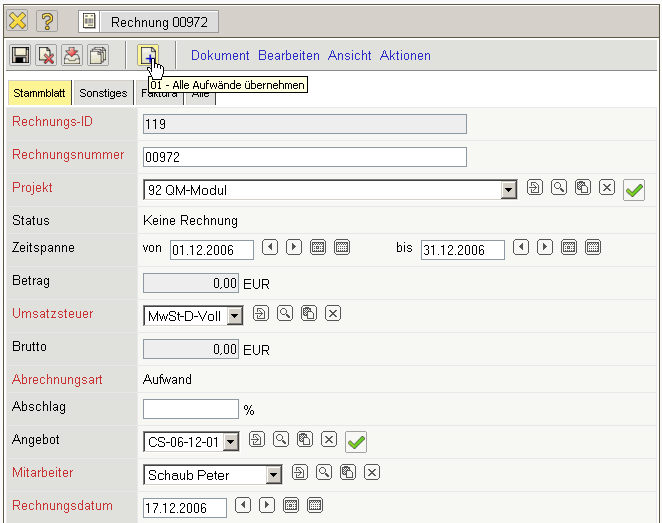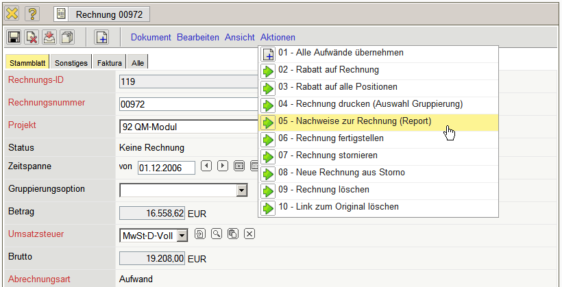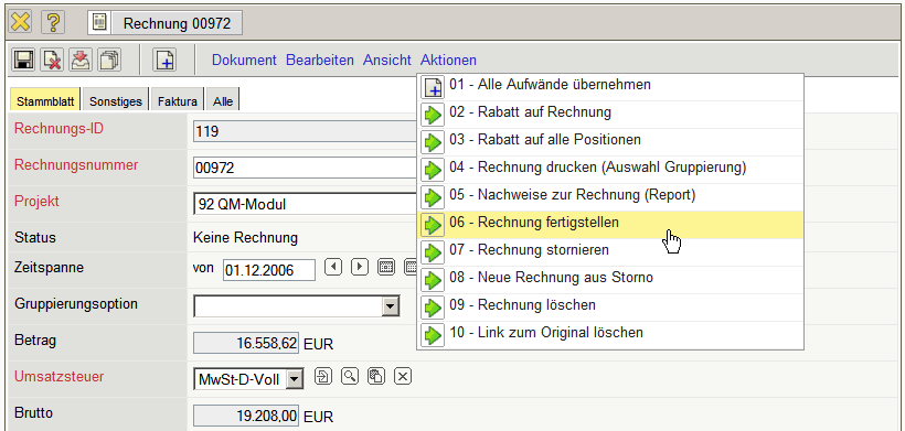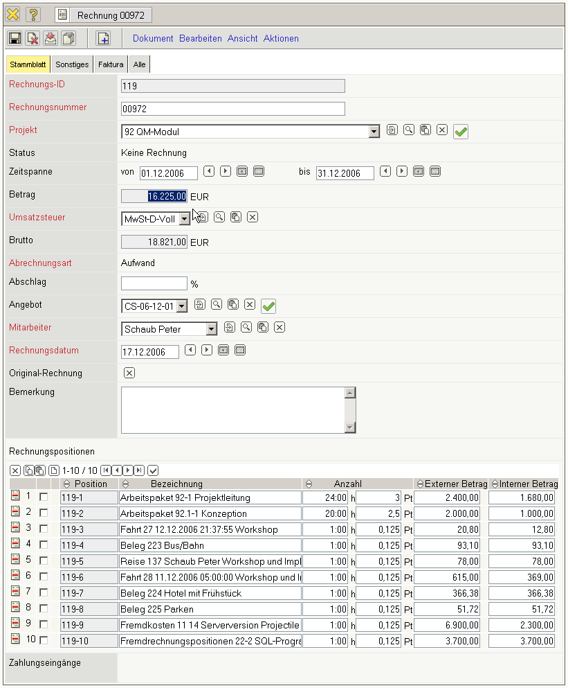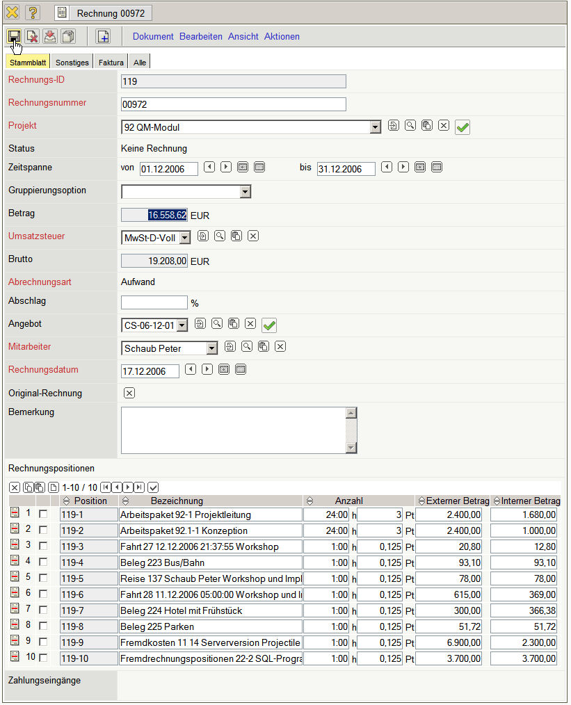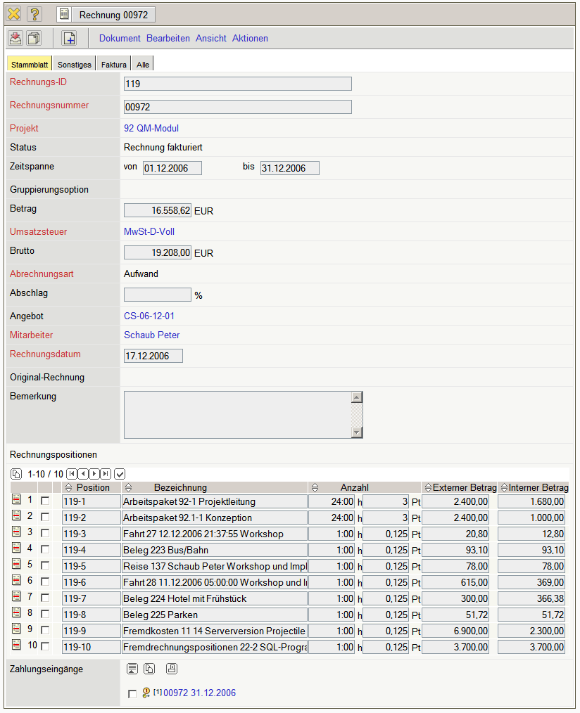 Die Rechnung erhält nun den Status Rechnung fakturiert und wird inklusive aller Positionen für Manipulationen gesperrt. Alle Positionen, die auf sonstigen Kosten basieren, werden im System als fakturiert gekennzeichnet. Bei den Arbeitspaketen wird die abgerechnete Dauer übertragen, damit die Arbeitspakete ggf. mehrmals für Teilrechnungen abgerechnet werden können. Bei Einsatz einer Schnittstelle zur Finanzbuchhaltung, werden nach Ausführung der Aktion auch ggf. Buchungssätze erzeugt …