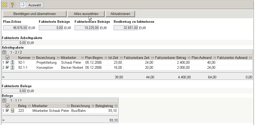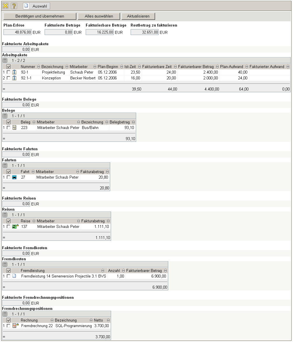 … die ausgewählten Arbeitspakete und Kosten als Rechnungspositionen in die Rechnung generiert. Im Beispiel unten werden zwei Arbeitspakete und acht Kostenbelege (eine Fahrt, ein Beleg, die Bestandteile der Reise, die Fremdkosten und eine Eingangsrechnungsposition) als Positionen in die Rechnung übernommen.