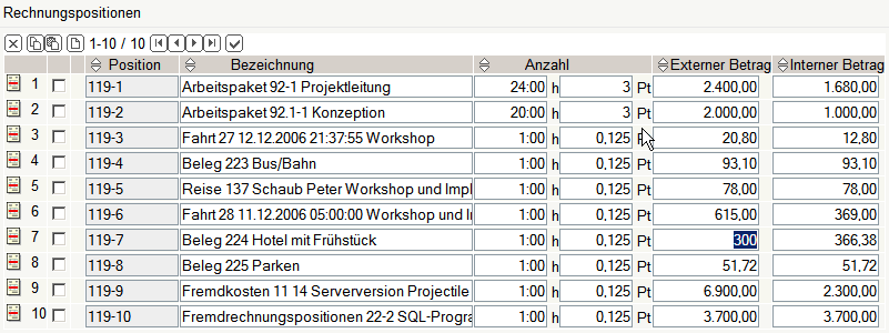 Die so erzeugten Rechnungspositionen können manuell geändert bzw. angepasst werden, in dem man das Feld Anzahl der Positionen oder den Betrag Extern ändert. Der zugehörige Stundensatz des betreffenden Arbeitspaketes ist im System bekannt und die Summe wird automatisch aktualisiert.