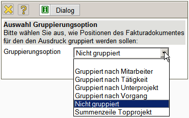 Hier kann zwischen Ausdruck auf Arbeitspaketebene, gruppiert nach Mitarbeiter, gruppiert nach Teilprojekten (1. Ebene anzeigen), gruppiert nach Tätigkeiten oder als eine Zeile mit Gesamtsumme auf Projektebene gewählt werden.