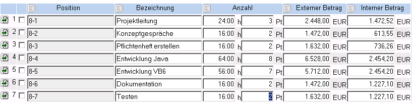 … wird die Rechnungsposition gelöscht und der Rechnungswert entsprechend vermindert. Anschließend wird noch die Position 8-7 Testen auf 2 Personentage Aufwand reduziert und die Rechnung abgespeichert.