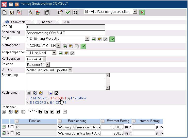 Wenn die Vertragsdaten definiert sind, kann für den Vertrag die nächste Rechnung (Aktion “Nächste Rechnung erzeugen”) oder alle Rechnungen für die Vertragslaufzeit generiert werden. Mit Hilfe der Aktion “Alle Rechnungen erstellen” werden für das Beispiel …