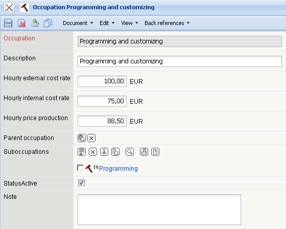 - Occupation: This alphanumeric field defines distinctly the occupation, in which one external and two internal hourly rates can be assigned.