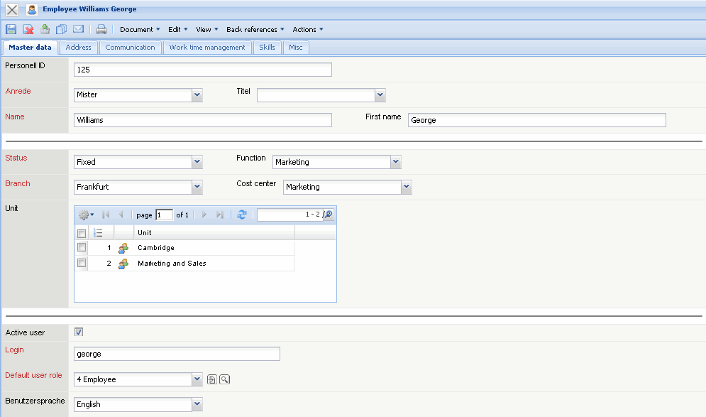 Unit: The units (organisation units, usually locations and/or departments)to which the employees belong can be entered in this field. These units can be used as the basis for the local permission system (see administration guide).