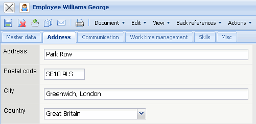 The Employee form administers the master data of each individual project employee. All information about the employee, e.g. personnel number (ID), the designated user group, the system login password, the employee's status, the location, the employee's name and address, department and function, types of communication, as well as work time administration are stored here.