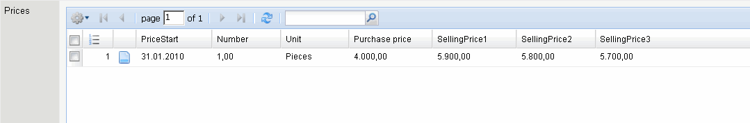 Prices: Differing prices between purchase price and selling price can be entered here. These prices have validity as well as up to three price stages and are administered in