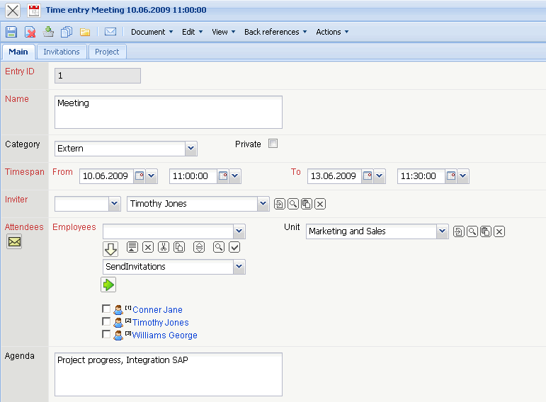 Inviter: These fields are preallocated from the system and specify the employee, who initiated the appointment. The inviter is also automatically entered in the participant list. The employee is defined in the employee form.