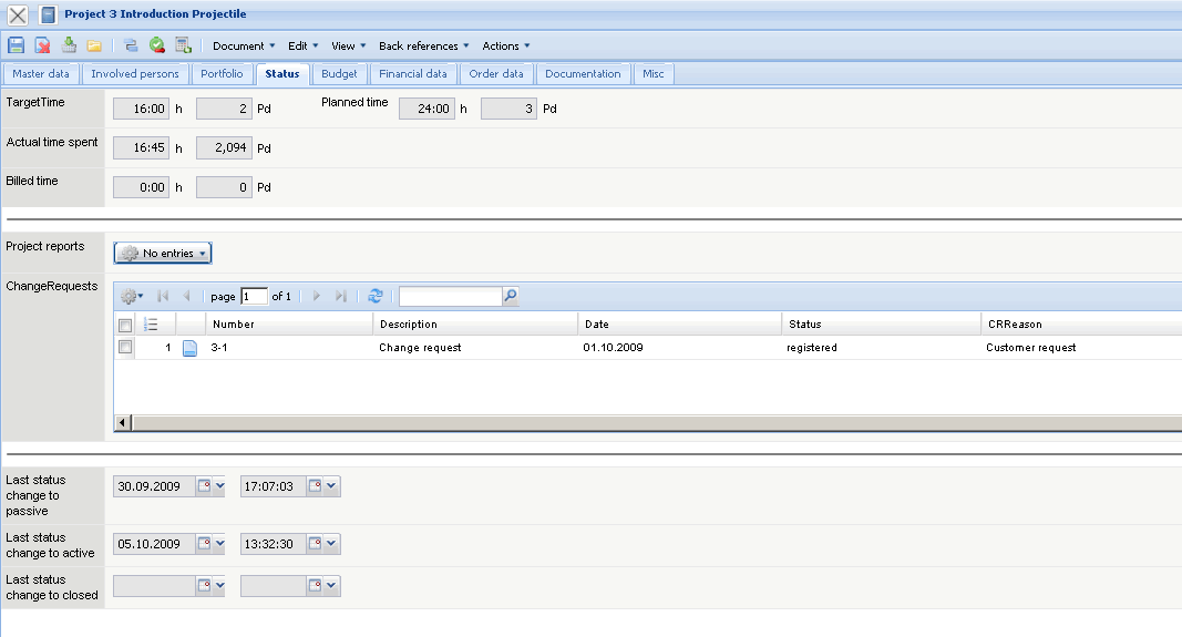 Project-CRs: The entered change requests for the project are listed here. The changes are entered in the project modification form.