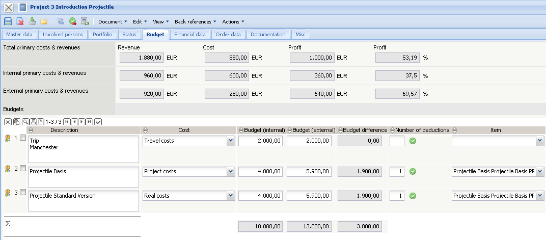 Project (Primary Expenses + Secondary Expenses): These fields contain the probable internal project revenue, project costs and the profits (absolute and percental). These costs result from adding the primary expenses to the budgets (secondary expenses).