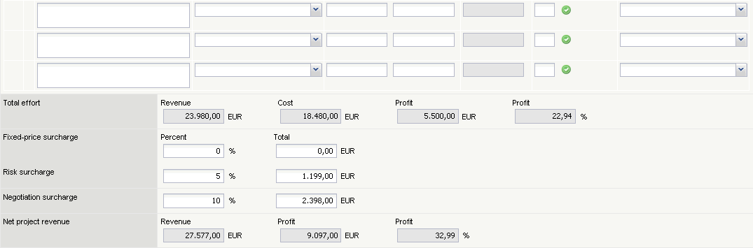 Surcharges (for example, fixed prices, risk, negotiation): These fields are designated for surcharges of the (planned) revenue. These surcharges have no influence on the planned costs of the project and are used for preparing the offer/quotation.