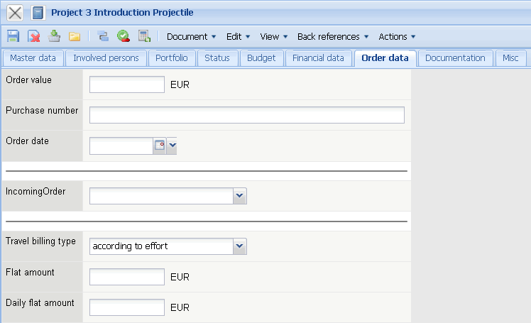 Order Value: This field can be used for defining the fixed price/flat rate (maximum upper limit for all invoices for this project). If the order value is defined here, the automatically defined value planned-revenue displays only the theoretical project budget, with the basis being the planned value from the jobs and the budget administration. The order value is transfered automatically from the system if an order confirmation is included as defined.