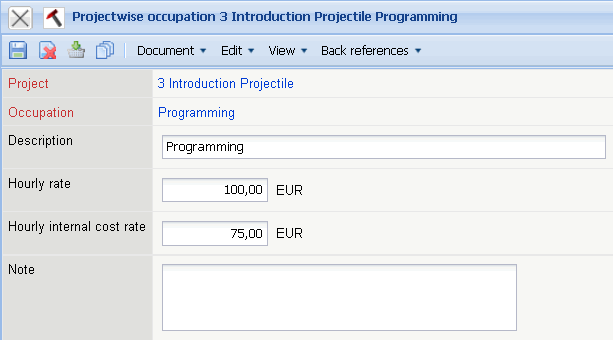 The Project-Related Occupation form administers the occupation rates, which are adjusted for a defined project. When these rates are defined for a project or sub-project, these values override the global occupation rates (see also costing and pricing).