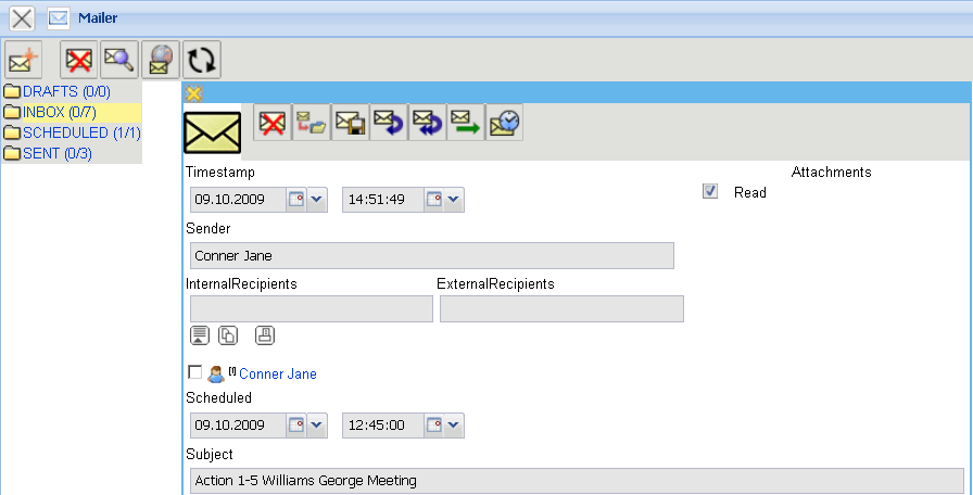 Projectile contains an internal messaging system. The function to receive the internal messages (passive Mailer) is part of the basic version. Using this function, the sent messages are displayed and can be opened for reading. Furthermore, the mails are also displayed in the personal calendar (Calendar plug in).