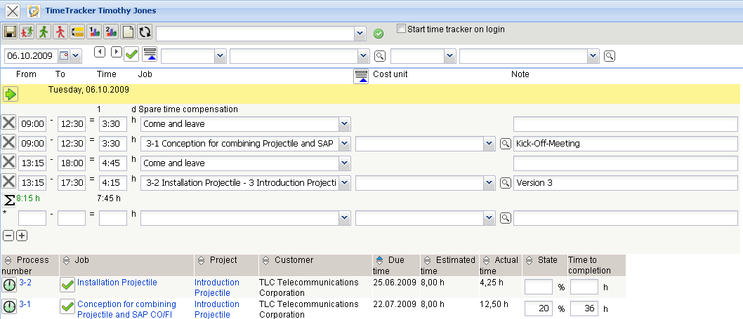 a new job can be created through the TimeTracker. Times can be immediately recorded here. - Refresh: Using this button