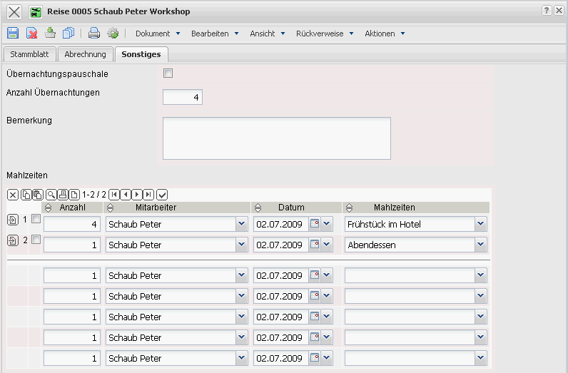 The Travel form is used for recording project-related business trips for an employee in the frame of a certain project. The daily benefits flat rates of the employees are calculated from the travel duration (difference from travel begin and travel end) and considering the daily benefits allowances and travel allowances. The amount entered from the receipts and traveling costs can also be assigned. Also, the meal posts for overnight stays are considered.