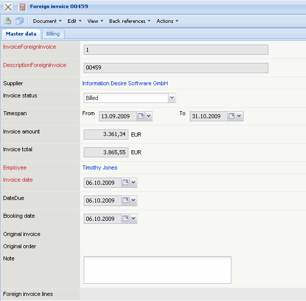 - Time Span(from/to): These fields specify the work/service intervals for the foreign invoice. With services, the periods are entered in which the billed services of the suppliers are rendered. This information is necessary for the accrual and deferral with the income statement . If this interval is not filled, the invoice date is used from the system.