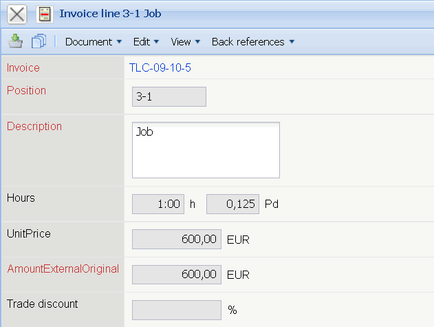 • External Amount before Trade Discount: This field is used as an overview to display the original amount of the position, when a trade discount has been warranted. Therefore, it is easier to reconstruct how the value in the field external amount has been compiled. The difference external amount before trade discount minus the trade discount equals the external amount.