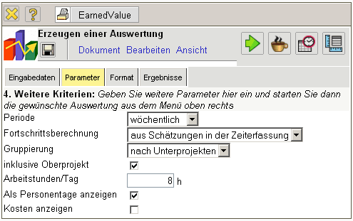 • Chart: The Earned Value Analysis contains the Earned Value Analysis. This chart generates the Earned Value Analysis for the selected project. With this, the planned values, the actual values and the progress for the project structure or further criteria are plotted. (abgetragen) The Earned Value results form the progress of the periods (difference from the grade of completion from the current periods to the previous periods) and the total planned time/effort. Furthermore, the key figures BCWS, ACWP and BCWP are determined and the results are visualized in two illustrations.
