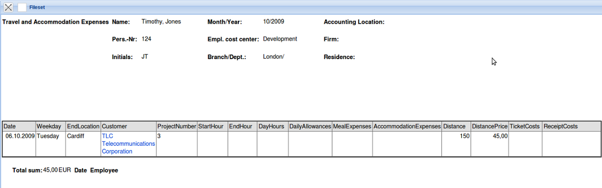 The data from car travel expense entry, travel expense entry and rapid entries can be evaluated in the allowable expenses report. The travel and allowance expenses report supports employee and evaluation time span selection criteria and can be customized in ReportMaker.