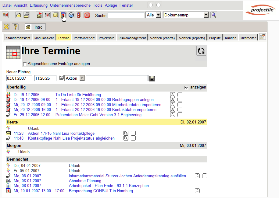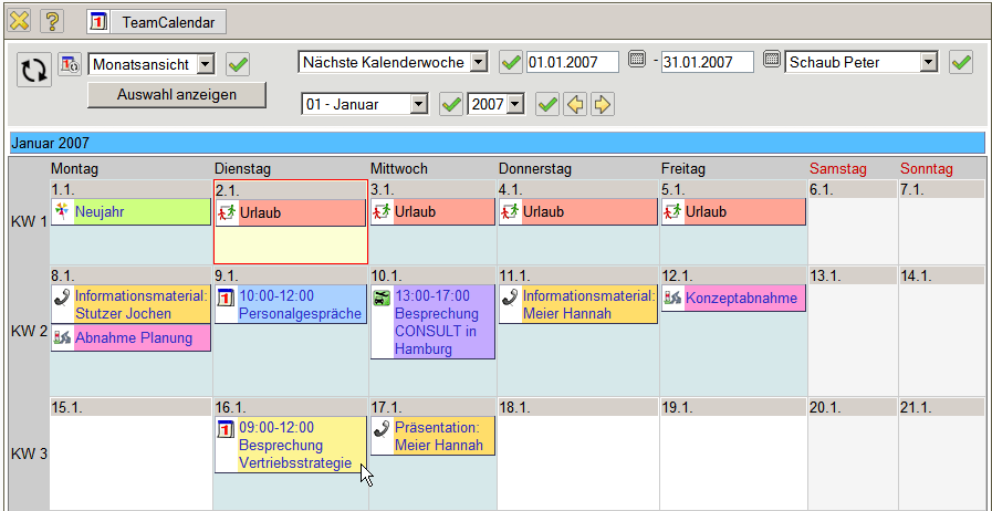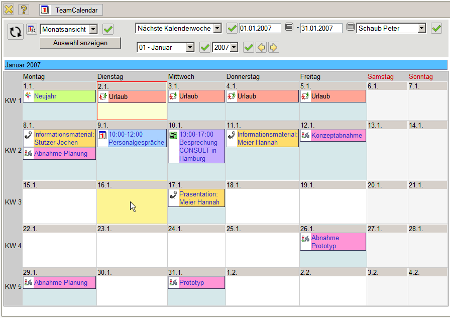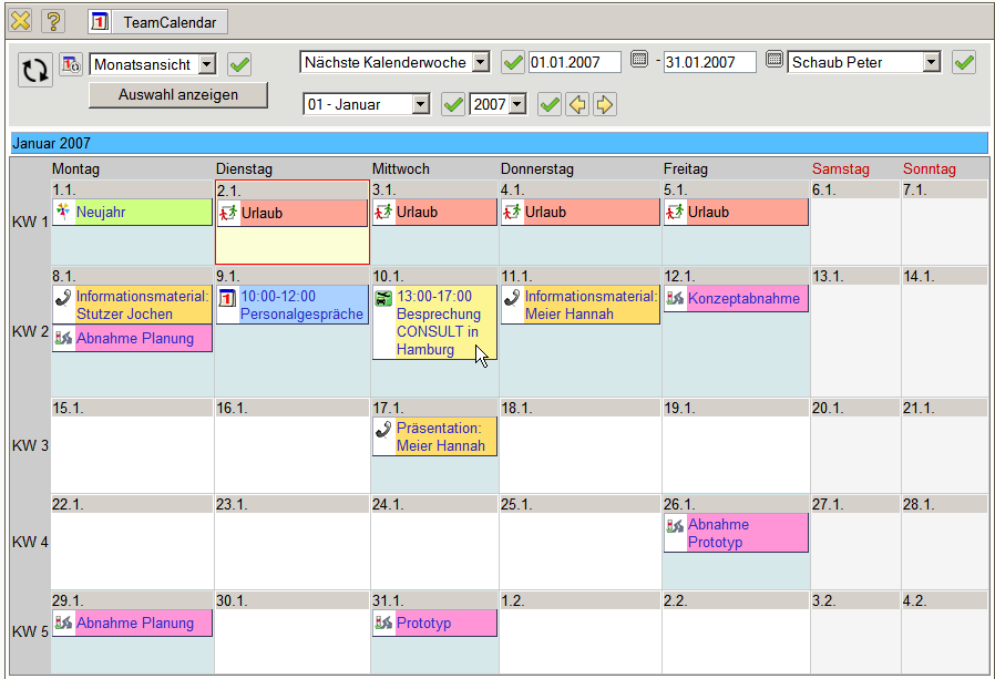 The group organizer manages project relevant appointments (milestones, external and internal appointments, project actions) and person-related events (absences, such as holidays and illness, bank holidays, general operations, …). The calendar can be opened for the user, the group (such as unit) or for all the employees for any period of time. With the appropriate permissions, appointments can not only be displayed, but also be defined.