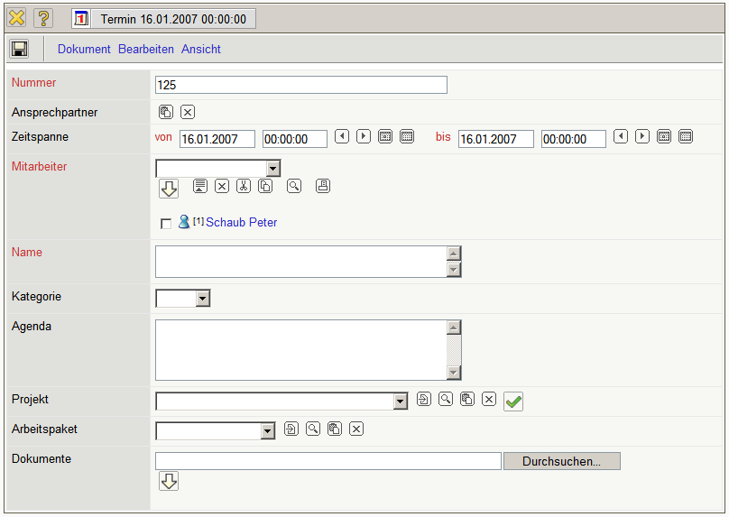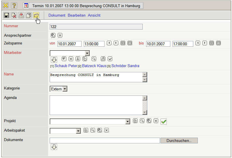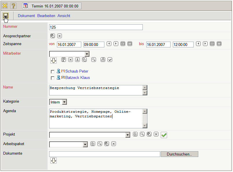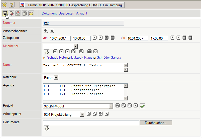 This includes the period of time (here, of 16.01.2007 9:00 to 12:00), the participants (with the possibility of multiple choice, (here the employees !!! and !!!!), the description/the name of the appointment, the category (internal/external ), further notes and possibly external documents. The appointment will be saved …