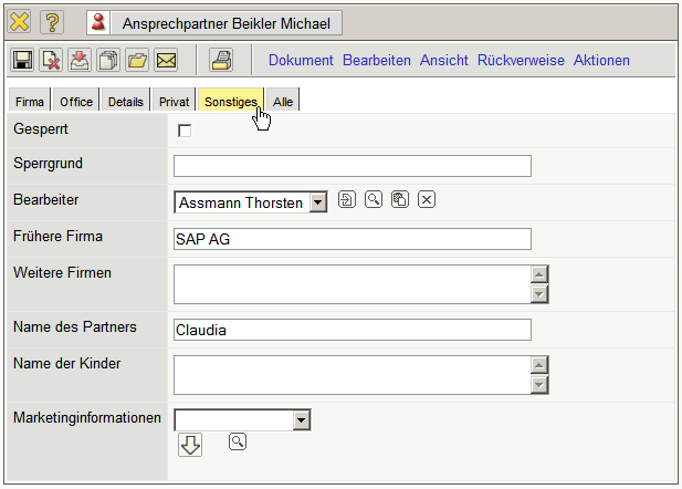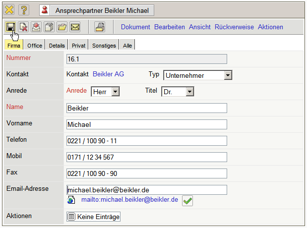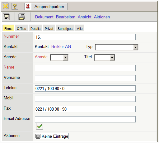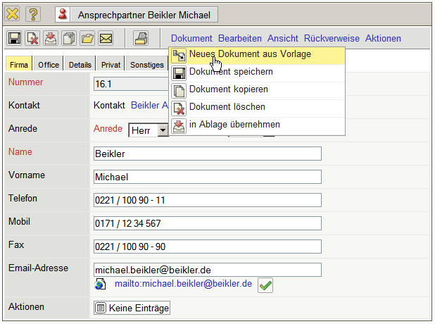 Das System erzeugt ein neues Dokument vom Typ “Ansprechpartner” und belegt den Kontakt (und einige Daten aus dem Kontakt) automatisch vor.