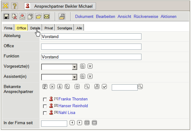 Auf dem Reiter “Office” kann die Abteilung, das Büro, die Funktion, Vorgesetzte®, Assisten(in), bekannte Ansprechpartner und “in der Firma seit” eingegeben werden.