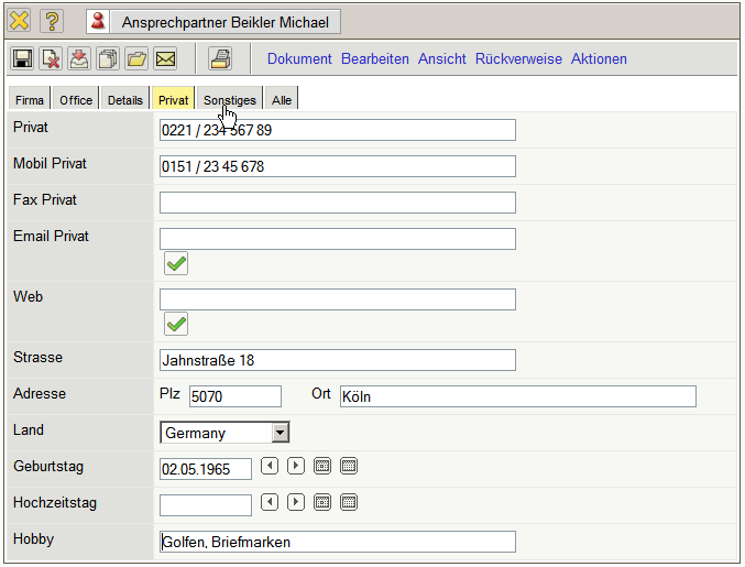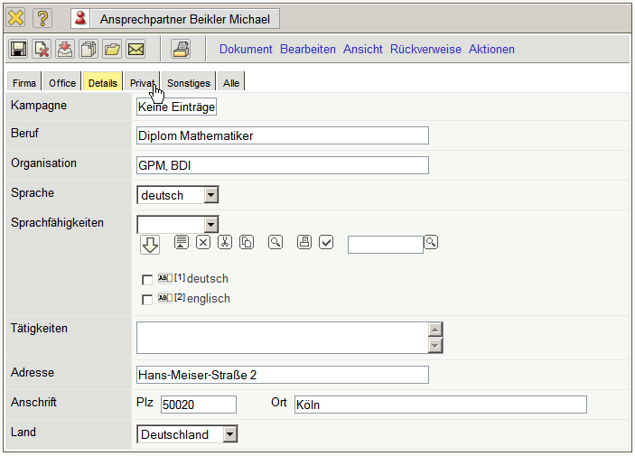 Auf dem Reiter “Privat” kann die private Telefonnummer, Mobilnummer, Fax und Email, Web- und Postadresse, sowie weitere private Informationen eingegeben werden.
