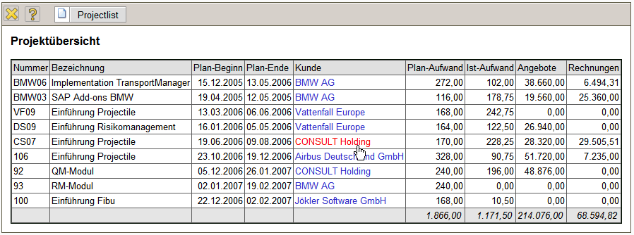 By default, only the user, who creates the ReportMaker, has access to the report. Each report can also be fitted with different authorizations (see also administration guide). In the following example, for the project list …