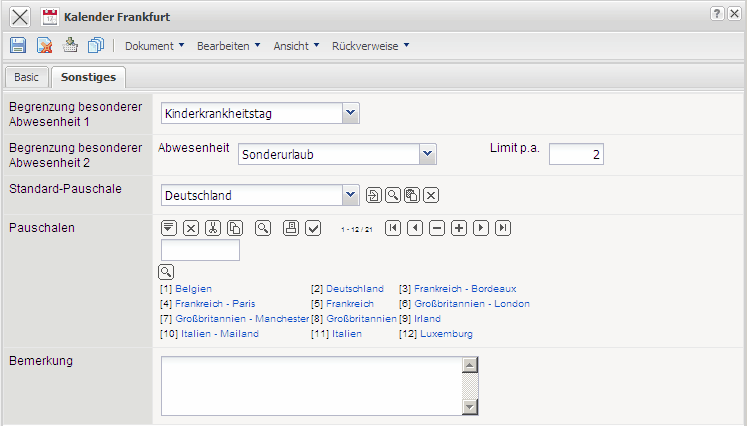 • Begrenzung besonderer Abwesenheiten1 und Abwesenheiten2: In diesen Feldern kann man den Grund der Abwesenheit auswählen (Kinderkrankheitstag, Sonderurlaub)