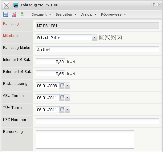 Die Maske Fahrzeug verwaltet die Fahrzeuge im System. Den Fahrzeugen wird ein Halter und Termine für Untersuchungen zugewiesen. Die Fahrzeuge werden für die Fahrtkostenabrechnung benötigt.