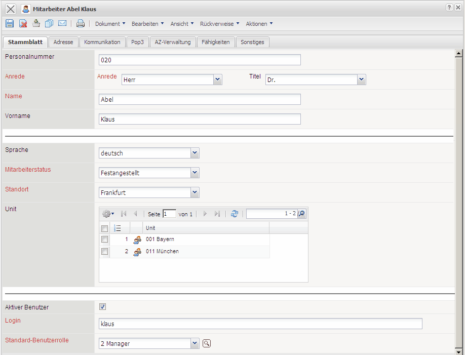 Units (Organisationseinheiten, in der Regel Standorte und/oder Abteilungen) eingetragen werden, zu denen der Mitarbeiter gehört. Diese Units können dann als Basis für das lokale Berechtigungssystem verwendet werden (siehe auch Administrationsleitfaden).