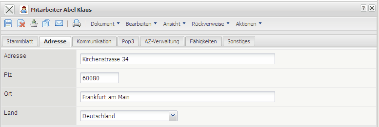 Anrede, Titel, Name und Vorname: Diese Felder kennzeichnen die Anrede oder/und den Titel sowie den Vor- und Nachnamen des Mitarbeiters. Die Merkmale für die Anrede können in den Collections definiert und geändert werden.