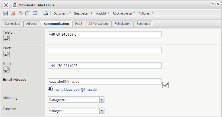 Die Maske Mitarbeiter verwaltet die Stammdaten der einzelnen Projektmitarbeiter. Hier werden alle Informationen über den Mitarbeiter, wie beispielsweise die Personalnummer, die zugeordnete Benutzergruppe, das Passwort zum Einloggen in das System, der Mitarbeiterstatus, Standort, Name und Adresse des Mitarbeiters, Abteilung und Funktion, die Kommunikationsmöglichkeiten sowie die Daten für die Arbeitszeitverwaltung hinterlegt.