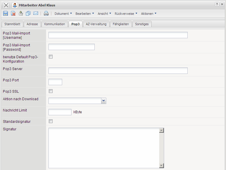 Telefon, Privat, Mobil und Email-Adresse: Diese Felder kennzeichnen die Erreichbarkeit des Mitarbeiters per Telefon (Büro, Privat und Mobil) und per Email. Das Klicken auf die Emailadresse öffnet das Standard-Mailprogramm des Benutzers mit der eingetragen Emailadresse. Die Emailadresse ist auch relevant für die Funktion der