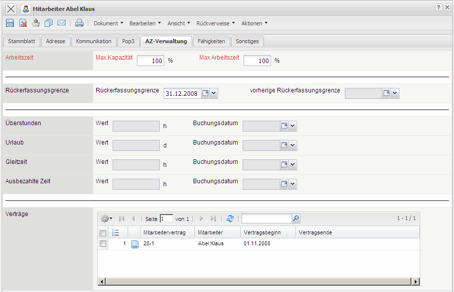 Verträge: In dieser Mehrfachauswahl werden die Verträge für die Mitarbeiter festgelegt. Verträge können über einen bestimmten Zeitraum definiert werden (siehe auch