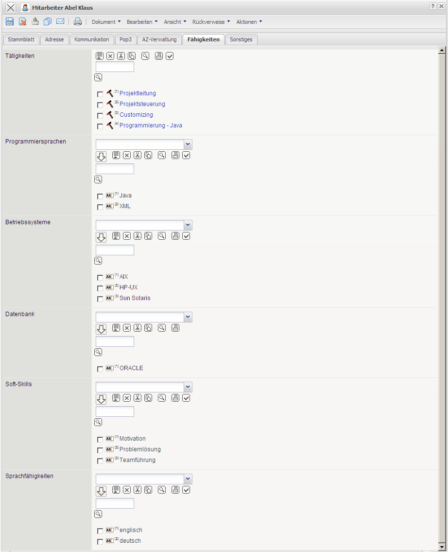 Abteilung, Funktion: Dieses Feld kennzeichnet dem Mitarbeiter seine Funktion innerhalb der Firma. Dieses Feld kann in den Collections definiert und geändert werden. Die Funktion des Mitarbeiters wie folgt ausgewählt werden (Consultant, Developer, Distributor, Finanzen, Graphiker, Manager, Marketing).