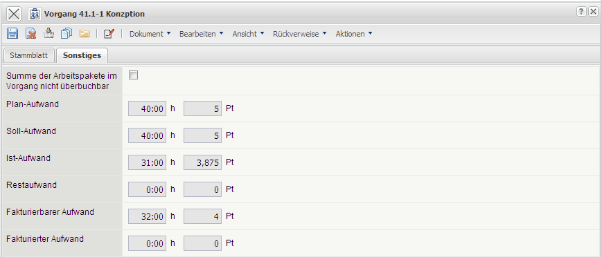 Fakturierbarer Aufwand: Dieser Wert zeigt den fakturierbaren Aufwand des Vorgangs an. Dieser Wert kann in der