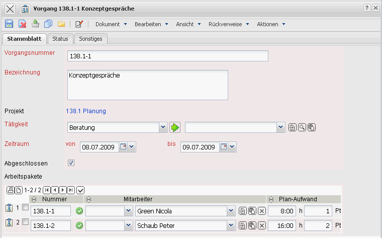 Arbeitspaket-Zeitraum (von/bis): Das Feld Plan-Beginn kennzeichnet den Start für die Abarbeitung des Vorgangs und wird bestimmt mit dem Plan-Beginn des zugewiesenen terminlich frühesten Arbeitspaketes und das Feld Plan-Ende kennzeichnet das Fälligkeitsdatum des Arbeitspaketes und wird vorbelegt mit dem Plan-Ende des zugewiesenen terminlich spätesten Arbeitspaketes.